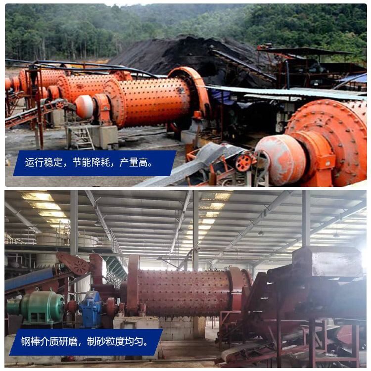 二、出料均勻產量高——采用先進的可控進出料棒磨機技術,結合實際用戶的研磨物料配用合適的研磨體,一改傳統球磨機的面接觸為線接觸,使制砂機的出料粒度更為均勻、產量更高, 適用于不同硬度(莫氏硬度 5.5 ~ 12 )的礦石。
