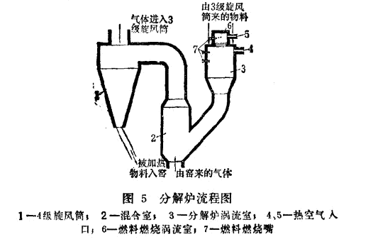 為了調(diào)整氣體動力學(xué)制度,分解爐內(nèi)設(shè)有節(jié)流閘板,它位于混合室的圓錐形異徑管下部。分解爐工作的特性為:它完全依賴于回轉(zhuǎn)窯的操作制度。分解過的生料粉進(jìn)入渦流室同回轉(zhuǎn)窯出來的熱廢氣相混合,并依靠廢氣熱令生料粉達(dá)到85-90%的分解。從混合室出來的含生料粉的氣體進(jìn)入第四級旋風(fēng)筒,生料粉在該筒內(nèi)與氣流分開,并沿傾斜溜管進(jìn)入回轉(zhuǎn)窯內(nèi)。