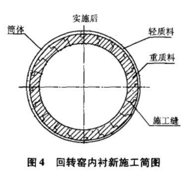 經(jīng)過(guò)與原料廠家、大修部門(mén)對(duì)該問(wèn)題的共同探討,較確定將原有兩條澆注料之間的直縫施工修改為有錯(cuò)臺(tái)的施工縫,阻擋在高溫條件下高溫炭粉由施工縫進(jìn)入輕質(zhì)料層;剞D(zhuǎn)窯內(nèi)襯新施工簡(jiǎn)圖見(jiàn)圖4。此項(xiàng)措施較明顯地改善了內(nèi)襯的使用狀況,次采用就使回轉(zhuǎn)窯內(nèi)襯的使用壽命提高到了440天以上。