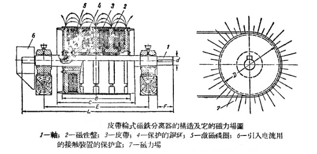 在皮帶輪式分離器內(nèi),沿著輪子的轉(zhuǎn)動(dòng)其表面會產(chǎn)生強(qiáng)大的磁場,在較小直徑處的磁場達(dá)到750-900奧斯特,較大直徑處磁場達(dá)到1200-1400奧斯特,當(dāng)即將進(jìn)行球磨機(jī)粉碎的物料內(nèi)金屬塊落到這個(gè)磁場時(shí),就會被吸進(jìn)并貼在筒上,然后脫落而被皮帶擲落到分離器下方的特殊卸斗內(nèi)。其具體結(jié)構(gòu)如圖: